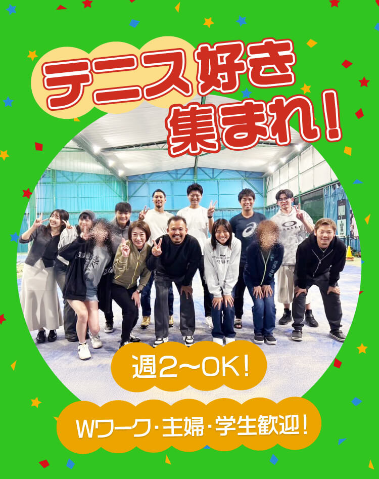 職種 テニスコーチ(経験者) フロントスタッフ(未経験) 雇用形態 社員・アルバイト(コーチ)アルバイト(フロントスタッフ) 給与 テニスコーチ 社員 月給 26万円 ※試用期間:6ヶ月(時給2000円) アルバイト 一コマ 90分 3,700円~ フロントスタッフ ※多数のご応募により募集は一度終了いたしました。 時給 1,060円~ ※能力、実績に応じて昇給有 勤務地 〒617-0002京都府向日市寺戸町殿長11「東向日」駅徒歩5分※車・バイク・自転車可 勤務時間 テニスコーチ 平日 9:30〜21:50土曜 8:00〜21:50日曜 8:00〜14:30※3h〜勤務OK!※テニスウェアを持参下さい。 フロントスタッフ 平日 9:00〜21:00土曜 7:30〜21:00日曜 7:30〜17:30※1日4、5h〜/週2日〜OK! テニスコーチ・フロントスタッフ 最低勤務期間 1年以上最低勤務日数 週2日最低勤務時間 1日4時間 休日 テニスコーチ 固定シフト※担当のクラスにより変動 フロントスタッフ 1ヶ月ごとのシフト制ご希望の日時をお聞かせください。週2日〜/1日4、5h〜OK!土日祝に入れる方歓迎!学校やプレイベートの都合に合わせて出勤日時はご相談ください。 必要経験 テニスコーチ 1年以上経験のある方/性別不問 フロントスタッフ ◇未経験者歓迎!丁寧に教えます◎◇学生・主婦・フリーターさん大歓迎!◇土日祝、連休シーズン勤務できる方大歓迎! 福利厚生 ◇車・バイク通勤OK◇駐車場、駐輪場完備◇交通費支給◇社内規定有り◇社員割引有り◇テニス好きには嬉しい社割有り◇社会保険完備(30時間以上働く場合)◇有給あり◇昇給あり◇週3以上働いている方には◇1年に2回賞与あり!◇インセンティブ有(入会者、グッズ販売)◇OJTあり◇制服貸与 ◇Wワークok(アルバイト)◇試用期間3ヶ月(アルバイト)◇食事会などあります! 公式サイト 〒617-0002京都府向日市寺戸町殿長11 LINEから応募する